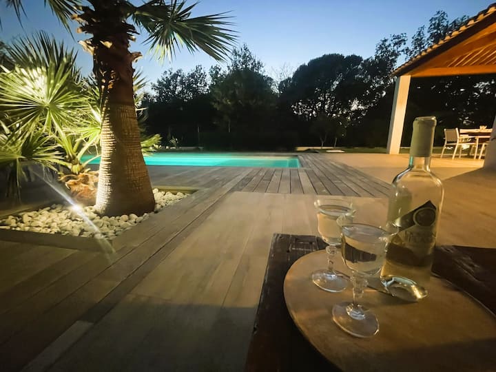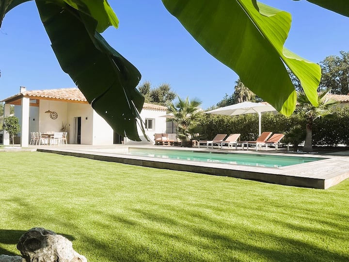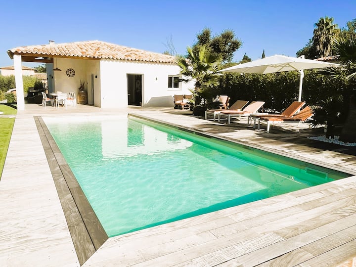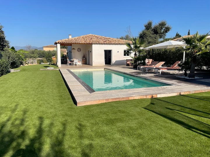 Прекрасна модерна вила на приземје која се наоѓа во тивка област, на крајот на уличката со базен во подножјето на карпата Рокбрун-сир-Аргенс.