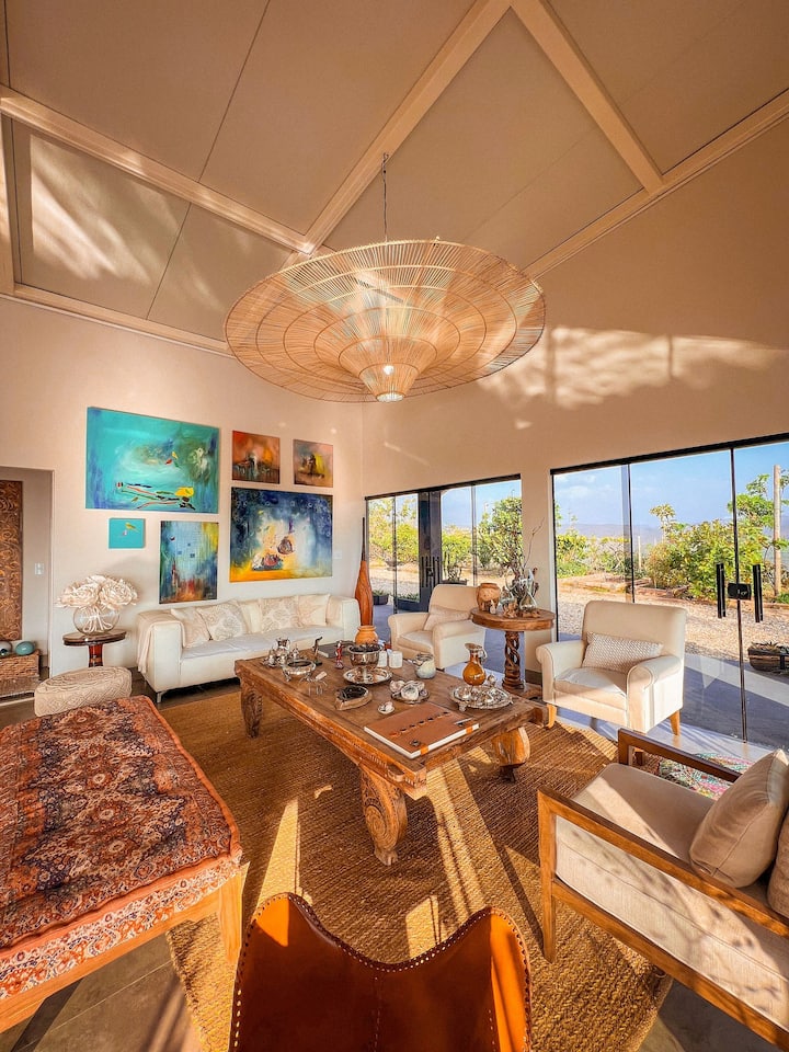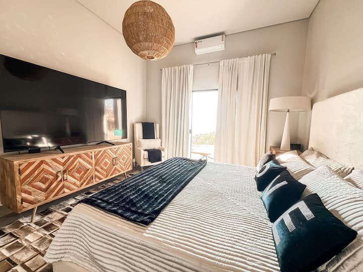 Откријте шармантно место за одмор во Пиренополис во близина на неколку атракции како што е патеката Кристален водопад. Нашата куќа од висока класа има 3 спални соби, вклучувајќи и главен апартман, нуди удобност, приватност и незаборавно искуство. На само 26 км од историскиот центар, пристапот е лесен: 25 км асфалтиран пат и 1 км земја. Уживајте во глетките што го одземаат здивот и зајдисонцето што го одзема здивот, што го прави вашиот престој