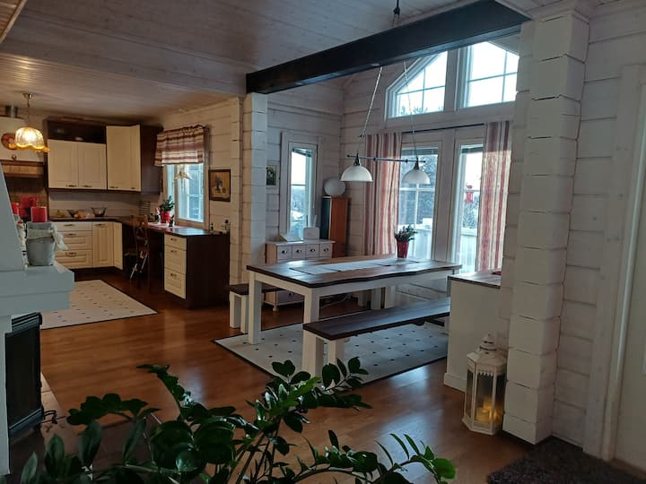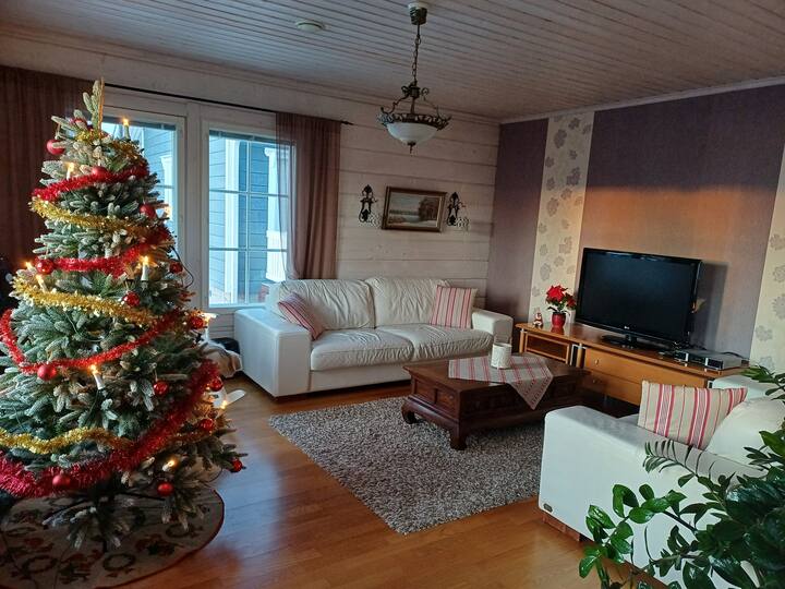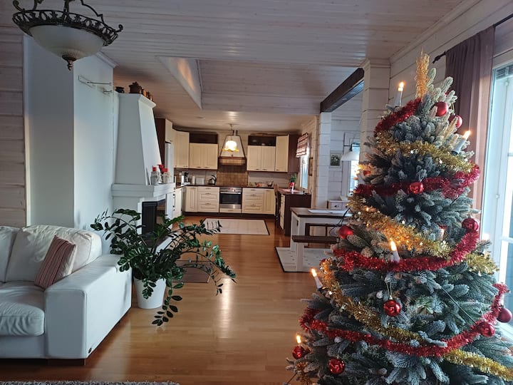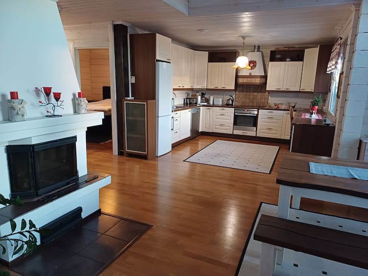 Ќе имате пристап до горниот кат на куќа од 98 м2 со 2 спални соби, дневна соба, кујна, тоалет и заеднички ходник. Фоајето на станот, заедничката бања/сауна, пералницата. Имам соба на долниот кат каде што живеам. Куќата е исто така достапна за целосно изнајмување, во тој случај цената е договорена одделно. Областа е на работ на градот,но растојанието до центарот на градот е само 6 километри, а селото Санта е оддалечено 9 километри. Можам да сместам 11 лица.