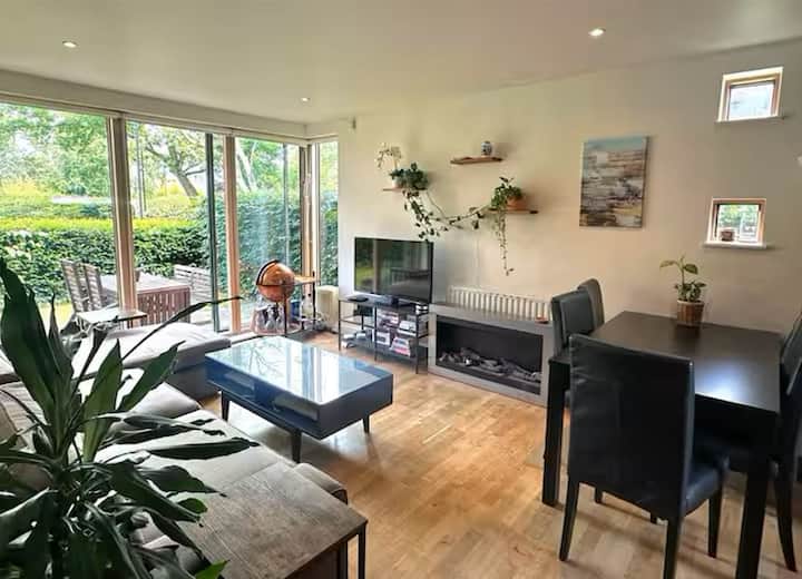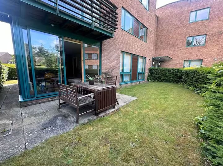 Модерен, опремен, стан на приземје, со: паркинг простор /комплекс од затворен тип/ приватна градина / 2 x спални соби (брачен и двоен) / када, туш/Apple TV/машина за кафе/машина за сушење алишта/машина за миење садови / биро и стол