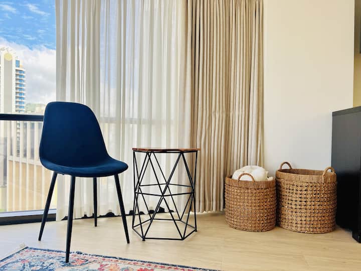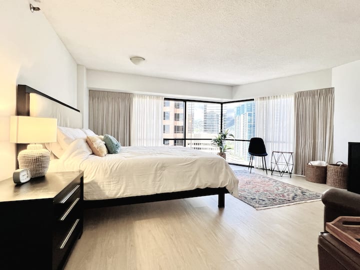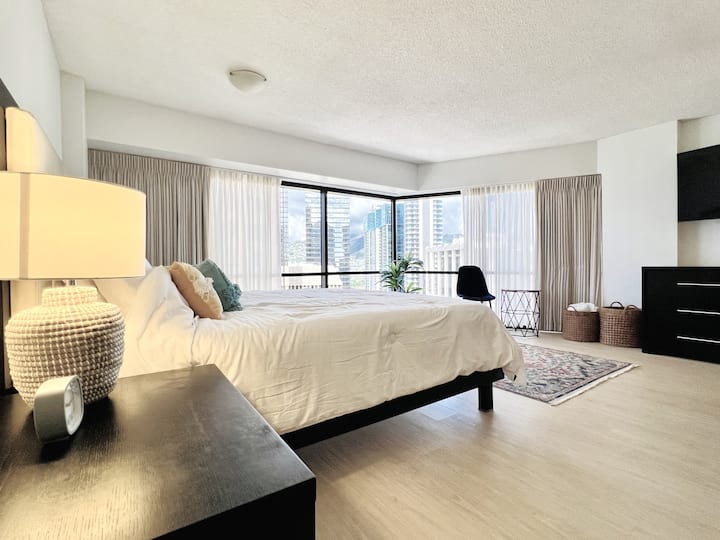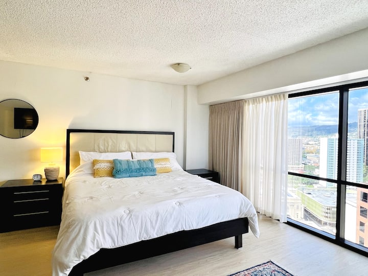 🏨 Доживејте го Хонолулу со стил со нашиот еднособен апартман на 24-тиот кат, со панорамски поглед и врвни удобности! 🛏️ Брачен кревет (широк 150-179 см) за двајца, 🛋️ простран дневен простор и 💻 бесплатен wifi/кабелска телевизија. 🛍️ Прошетајте до Walmart, Ross, 7-Eleven и до најпопуларните места за јадење. 💪 Пристап до деноноќно обезбедување, бесплатен паркинг. 🏊 Опуштете се покрај големиот базен или уживајте во џакузито. 💨 Непушачи. 🛍️ Во близина на шопинг во центарот на градот. 🛏️ Совршено за парови или самостојни патници кои бараат луксуз и удобност. 🏨🌺