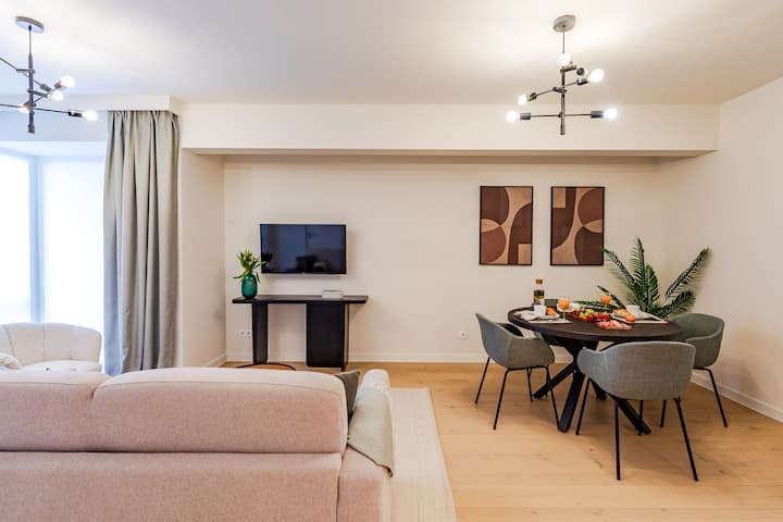 ✔ Светла и пространа дневна соба со големи прозорци кои водат до мал балкон. Има кауч на спуштање со димензии 180 см x 200 см, телевизор со рамен екран со Netflix и отворен трпезариски простор.