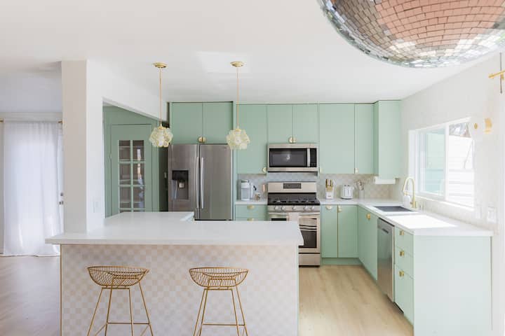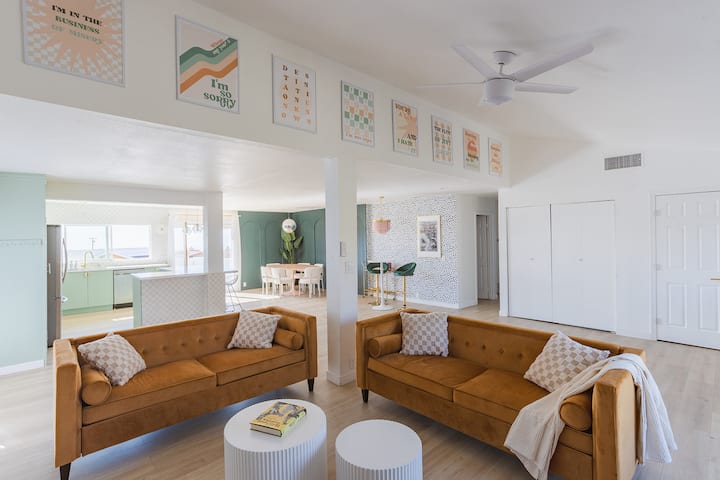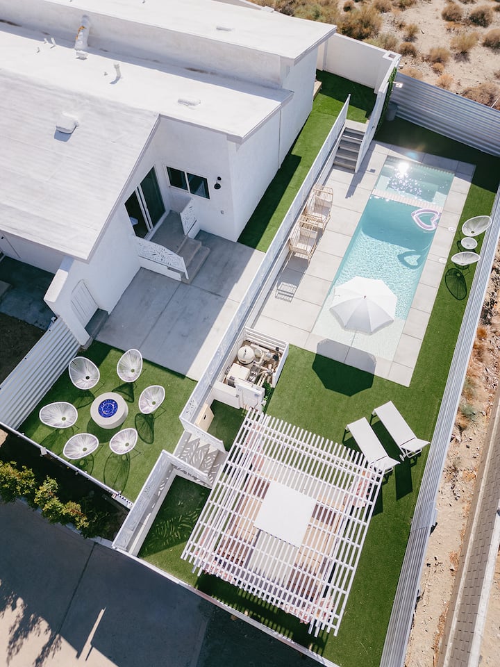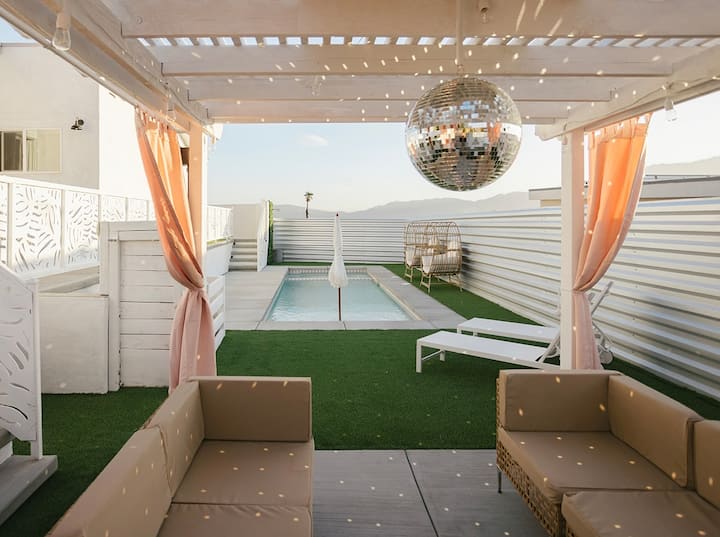 Pigment Palms, вашата куќа за одмор достојна за IG. Идеално за момински групи, семејство и пријатели или романтични сместувања. Овој модерен резорт ги спојува Палм Спрингс и естетиката од 2000 година, за забавна, но бајковита атмосфера. Пливајте во нашиот базен со розови плочки, опуштете се во хидромасажната када за 10 лица или гледајте светлосен шоу од нашиот диско топ во кабина покрај базенот. Гответе во кујната на отворено, уживајте во зајдисонцата и ѕвезденото небо покрај огништето на отворено, уживајте во туширање на отворено или во филмска вечер покрај каминот во затворен простор.