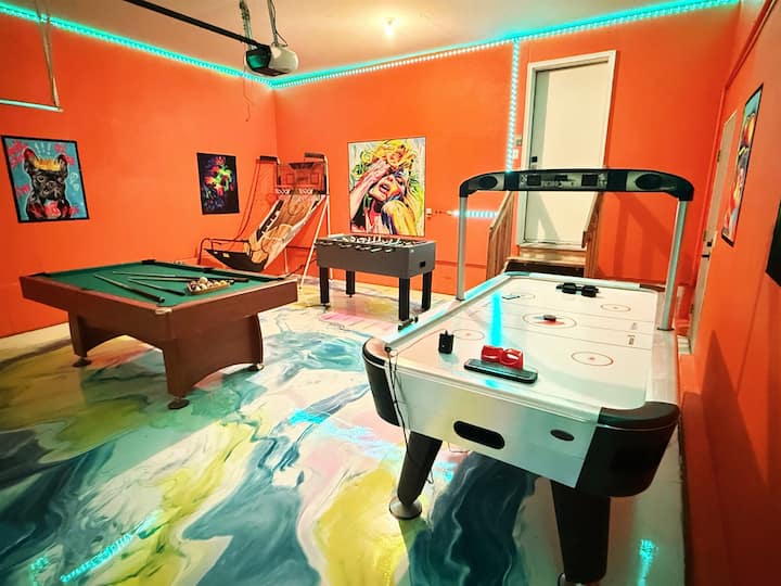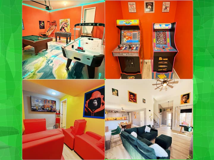 420-пријателски престој | Соба за игри и аркади | Театар со машина за пуканки | 5 спални соби, 2,5 бањи | Телевизори во секоја соба | Просторен паркинг | Ограден двор | Совршен за групи и престои!