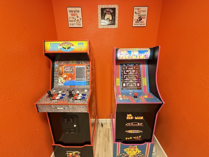 ⭐ Забава во изобилство: соба за играње во гаражата (билијард, воздушен хокеј, фудбал, обрачи) + аркада и кино во приземјето (65-инчен телевизор + пуканки + Street Fighter II и Ms. Pac-Man).