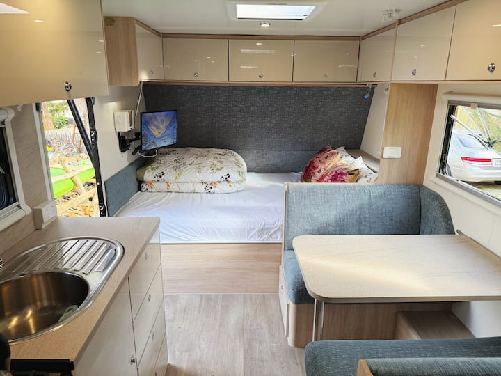 • 🚐 Удобна голема приколка: брачен кревет (со електрично ќебе) + кревет на спрат (должина 185 см, погоден за гости под 175 см во висина), може да прими 4 лица