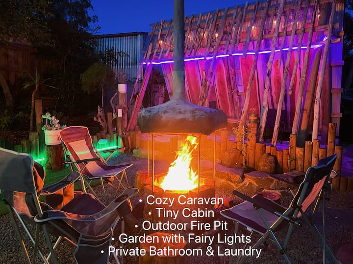 Целиот простор во оградениот двор е само за вас за време на ова патување.Караванот е опкружен со пријатна триаголна дрвена куќа, шпорет за кампување и посебен надворешен тоалет. Исто така, има и куќичка за кучиња со стреа и мека трева покрај неа.