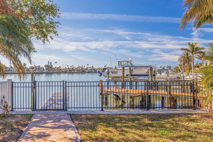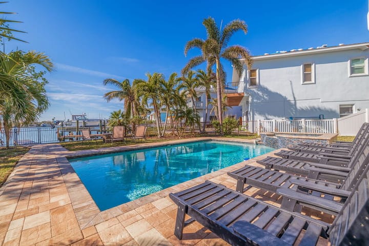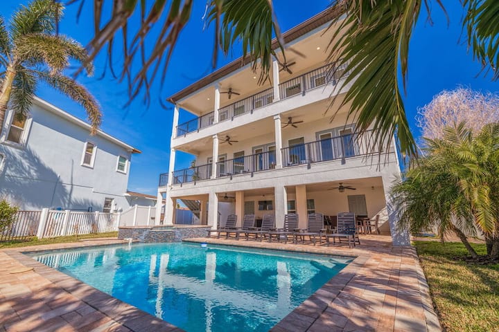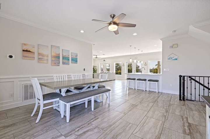 Moonlight Bay на 4-та е дом со 6 спални соби/3 бањи со базен кој се наоѓа на меѓубрежниот воден пат и во него може да се сместат 12 гости. Овој прекрасен дом на брегот нуди 3 нивоа на внатрешен/надворешен простор за живеење! Просторен отворен план на катот со прекрасна кујна, бар за седење за секојдневна вечера заедно со формална трпезарија. Голем дел во дневниот простор со телевизор со голем екран и камин за времето кога сакате само да се опуштите во затворен простор. Главниот кат има ѕидови од прозорци кои го доловуваат заливот и прекрасните меѓубрежни води. Неверојатниот надворешен простор во резортски стил вклучува 2 покриени балкона на повеќе нивоа и тераса на приземје на брегот со трпезарија на отворено. Лежалки за сончање наредени на работ на базенот. Во приземјето, ќе најдете одлично место каде што ќе се одморите од сонцето и ќе уживате во игротеката. Изнесете го омилениот пијалак на балконот и фатете го секое изгрејсонце и зајдисонце! Внимавајте на делфините кои си играат во заливот. Оваа куќа за одмор има вистински начин на живот во Флорида...создавајте спомени и враќајте се од година во година!!