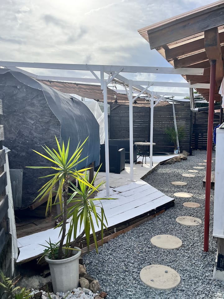 Тивко сместување за изнајмување во близина на сонцето и морето (со сауна и отворен базен)