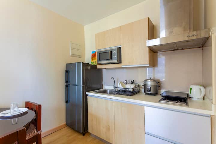 Одличен, светол простор за 1 – 4 гости. Wifi со брзина од 150 Mbps. Soho Central Private Residences се наоѓа пред трговскиот центар Shangrila. Единицата има: A/C Греен туш Крпи за бањање Фен за коса Пегла 1 брачен и 1 единечен воздушен душек, трпезариска маса со 3 седишта Електричен шпорет со издувни гасови Електричен вентилатор Фрижидер Микробранова печка Готвач за ориз Тостер рерна Електричен чајник Кујнски прибор Трпезариски комплет.