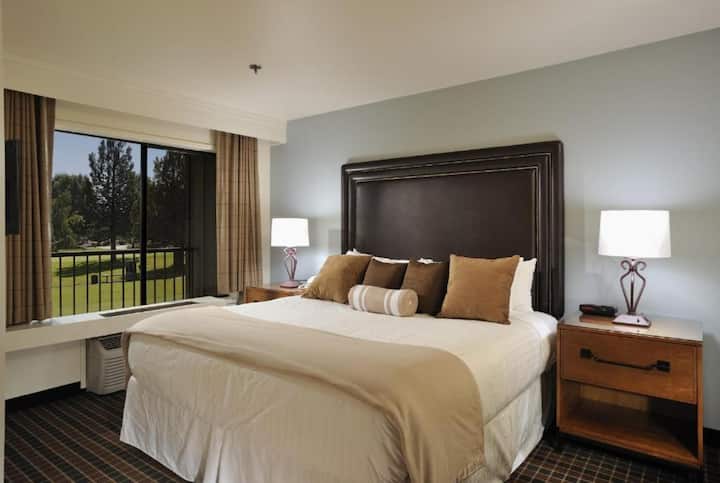 Опуштете се во овој простран апартман со приватна спална соба со кадифен кревет со перница со големина на брачен кревет. Одделната дневна соба нуди кауч на спуштање, фрижидер за ужина и погодна кујничка опремена со микробранова печка и машина за кафе. Уживајте во освежително искуство во бањата со посебен туш и излезете надвор на приватен балкон или тераса за да уживате во спокојниот резорт или поглед кон теренот за голф. Останете поврзани со безжичен интернет и широки опции за кабелска телевизија, вклучувајќи го и HBO.