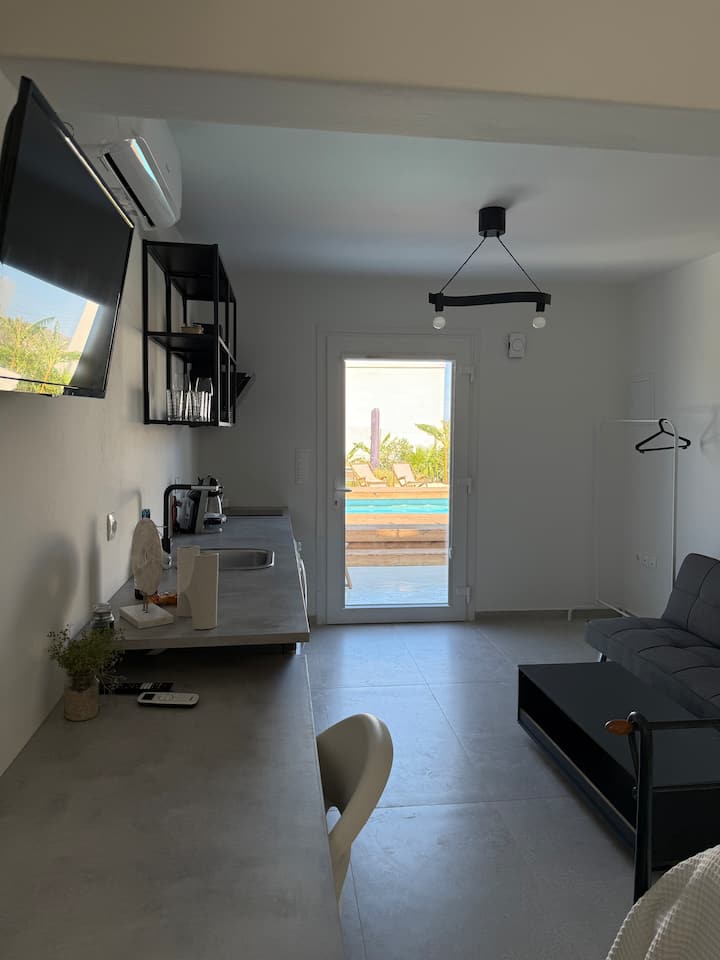 Минимален базен со крем стан во Парос