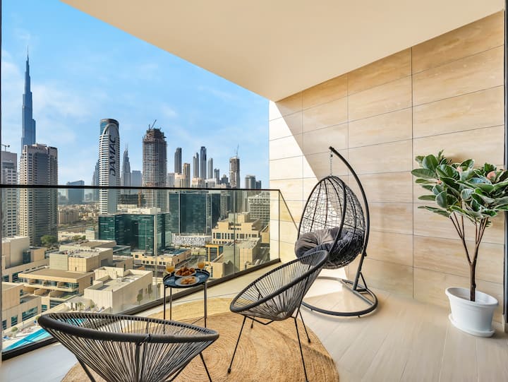 Модерно 1BR | Приватно џакузи | Поглед кон Бурџ Калифа