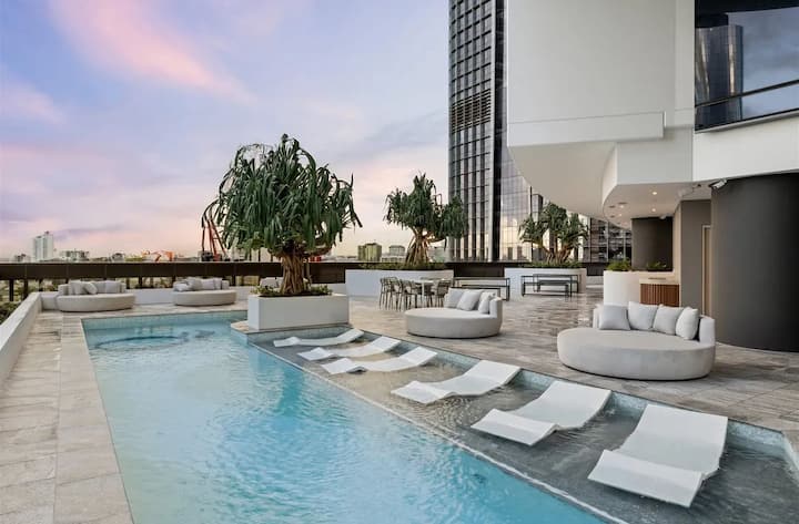 Без разлика дали сте тука за бизнис или за одмор, се наоѓате на само неколку минути од јавниот превоз, кафулињата, градските ботанички градини и најпопуларните атракции во Бризбејн. Уживајте во најдоброто од двата света со мирен, стилски живот и неспоредлив пристап до сѐ што градот може да понуди.