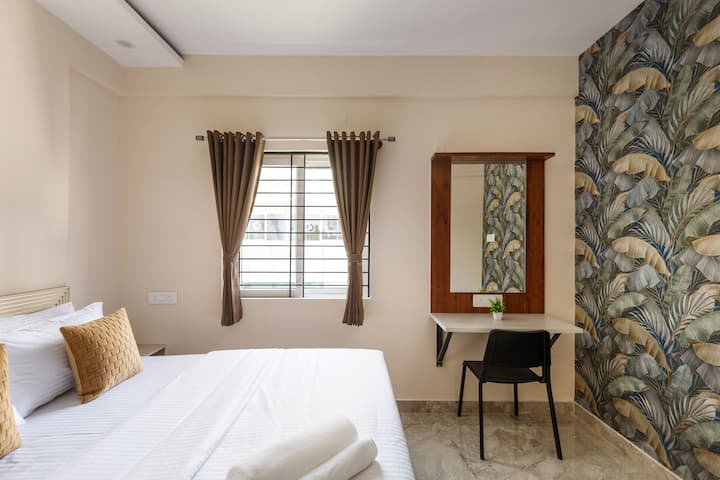 Доживејте го премиум живеењето во приватен 1BHK со балкон во луксузната Корамангала. Идеални за парови, професионалци и деловни патници, нашите модерни објекти нудат брз Wi-Fi, чистење, целосно опремена кујна, пристап до заедничка градина со тераса, машини за перење и машини за сушење алишта. Сместено во близина на најдобрите кафулиња, ресторани и канцеларии, ова мирно сместување ги комбинира удобноста и практичноста во едно од најоживените соседства во Бангалор.