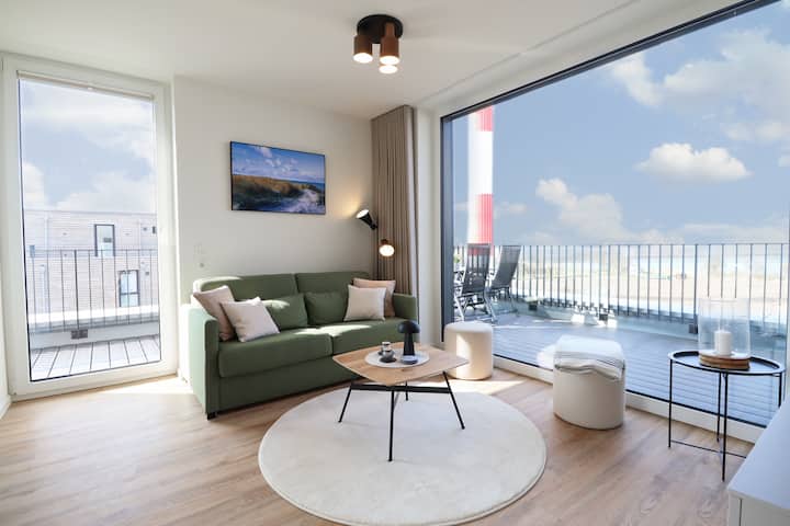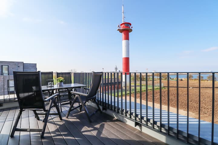 На вашата приватна тераса на покривот на најдобрата локација на Балтичкото Море, може да уживате во неспоредлив, непречен поглед на морето и шармантниот светилник. Без разлика дали за појадок на свеж морски ветер или релаксирачко зајдисонце навечер – тука ќе доживеете вистинско празнично чувство. Удобните места за седење ве покануваат да се задржите и да го направите престојот посебно задоволство.
