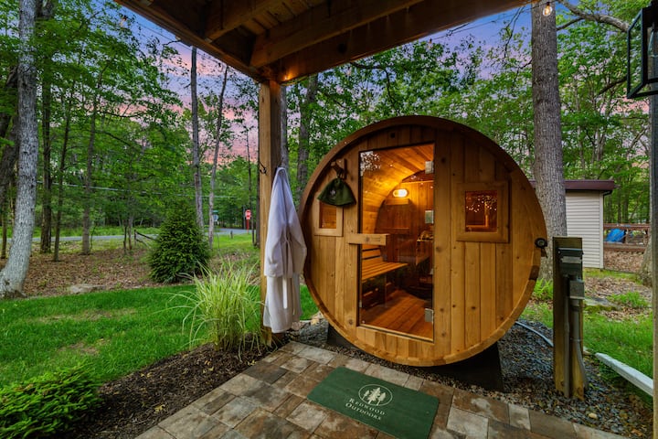 Вашата приватна оаза на отворено вклучува сауна во форма на буре, хидромасажна када за 6 лица, висечка лежалка, дворски игри, комплет за играње, двор, скара и стол за лулање. Имајте предвид дека заедницата не дозволува огништа на отворено, дури и ако се огласени на Airbnb по грешка.
