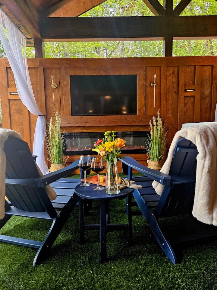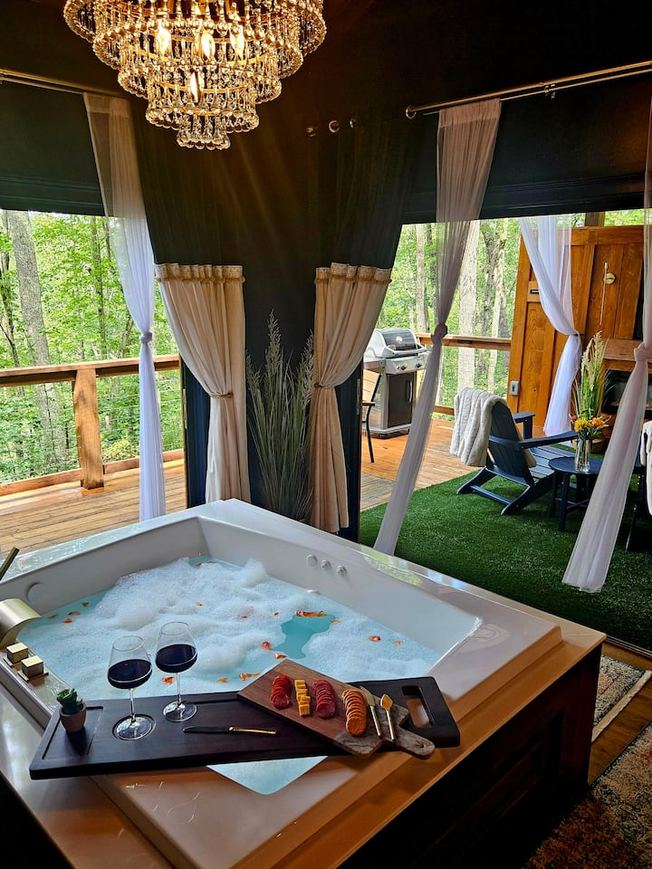 Само за возрасни: покриен камин и телевизија со хидромасажна када