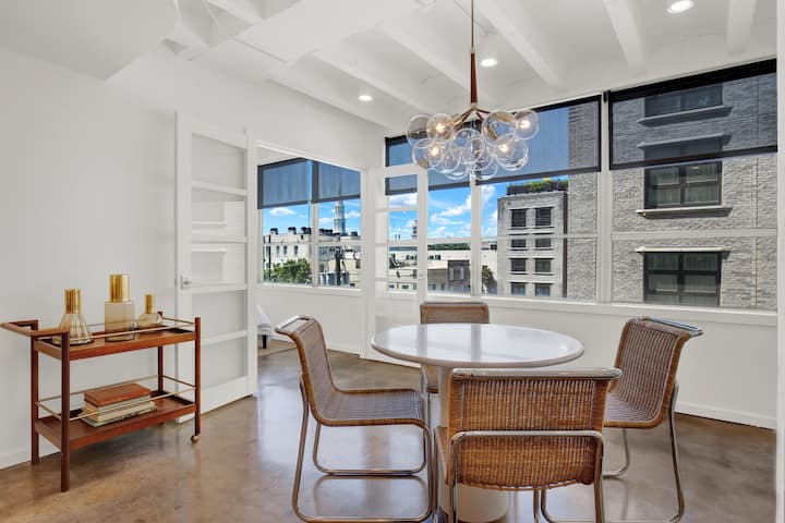 Влезете во Liberty од средината на векот и откријте внимателно уреден кондоминиум кој зрачи со удобност, карактер и луксуз. Дневната соба ве поканува со луксузни места за седење, чисти линии и изобилство на природна светлина што струи низ големи прозорци кои нудат поглед на околната историска област. За ваша погодност, монтиран е паметен телевизор со можности за емитување. Совршено е за пријатна вечер со вашите омилени серии или филмови по цел ден разгледување знаменитости. Овој простор, исто така, нуди погоден кауч на спуштање кој го трансформира просторот во дополнителен простор за спиење.