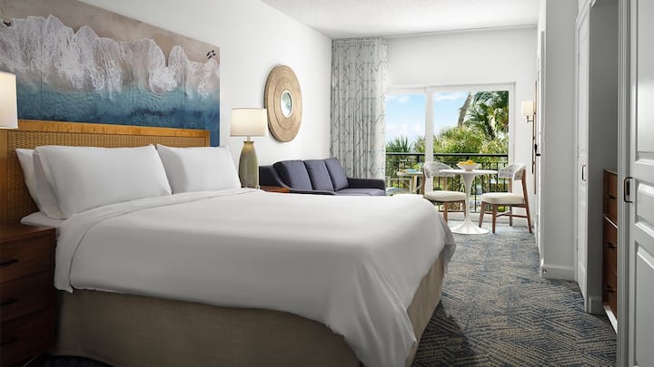 Оваа добро опремена вила во студио има брачен кревет (широк 150-179 см), кауч на спуштање, приватен балкон со поглед кон Атлантикот и погодна кујничка - плус пристап до базени, хидромасажни кади, патеки на плажа и целосни удобности во резортот. Совршеното место за одмор во Јужна Флорида ве чека! 🌴✨