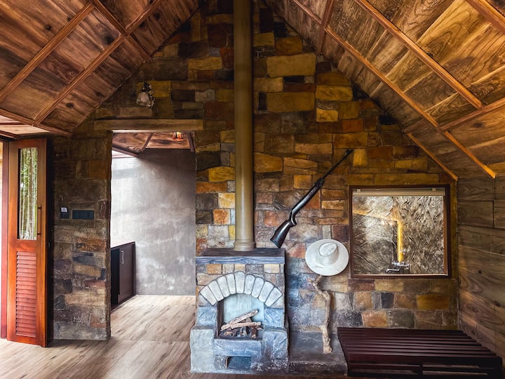 Камин од камен со цевка за оџак