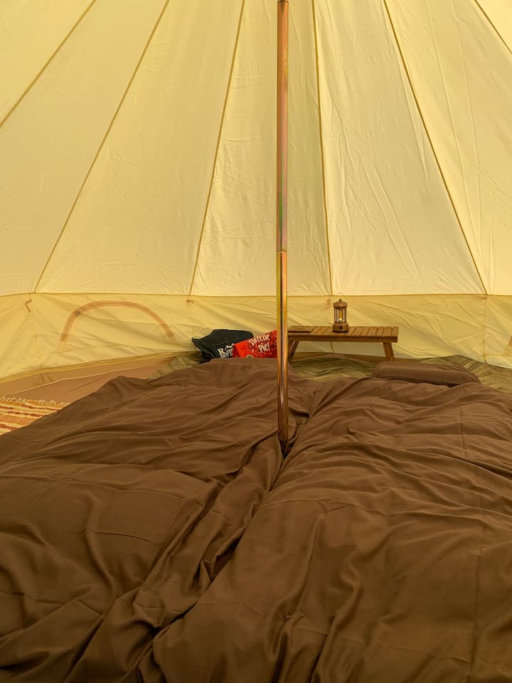Шаторот со ѕидови од 4 метри има топол тепих и керамички вентилатор за греење