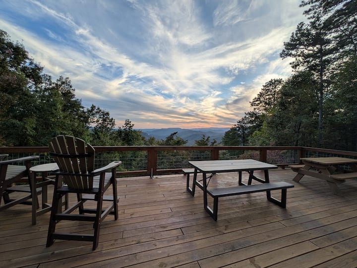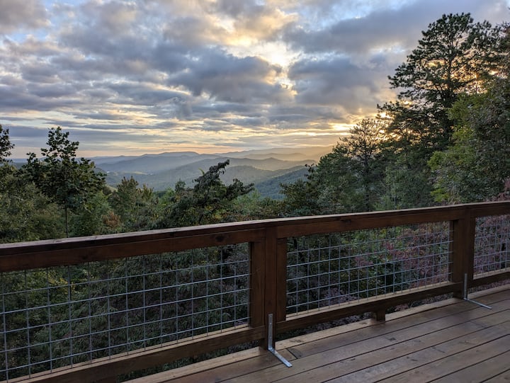 Удобностите вклучуваат огромна задна тераса од 4,5 x 12,7 метри свртена кон југозапад со две маси за пикник, повеќе столови, маси и скара на јаглен. Оваа тераса ви нуди панорамски поглед кон околните планини во северниот дел на Јужна Каролина. Отворениот простор за дневна/трпезарија има камин на дрва, висок засводен таван и многу големи прозорци со прекрасен поглед. Чистата кујна има и прекрасен поглед и е целосно опремена со апарати за кафе (не Keurig), кујнски робот Bullet, блендер, нова полица за зачини и тостер за четири парчиња. Ножевите се остри (нов сет Henckel), а целиот сет тенџериња и тави се класични, со бакарно дно Revere Ware. Уживајте во вкусот на свежата планинска вода, нема потреба од флаширана вода или филтри. Машината за перење и сушење се наоѓаат на главното ниво, како и спалната соба 2 која има два кревета со големина XL и надворешна врата до задната тераса. На главното ниво има бања со тоалет.