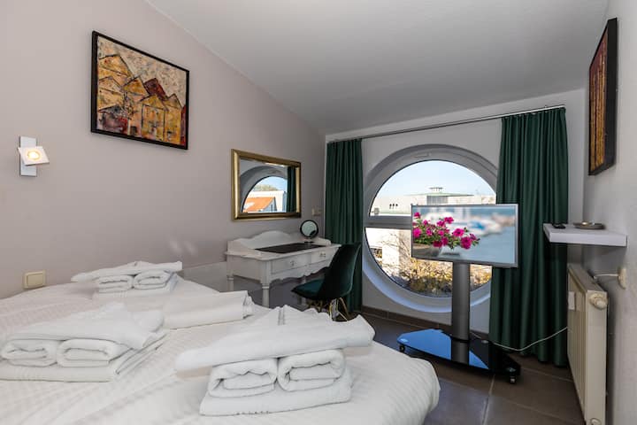 Исто така, може да стигнете до многу посетениот кеј со големиот двор за неколку минути. Многу обиколки со брод започнуваат од тука, на пример до Warnemünde.