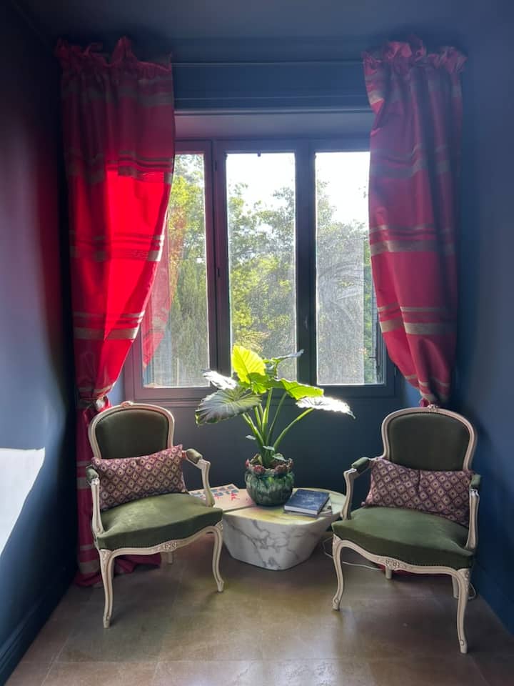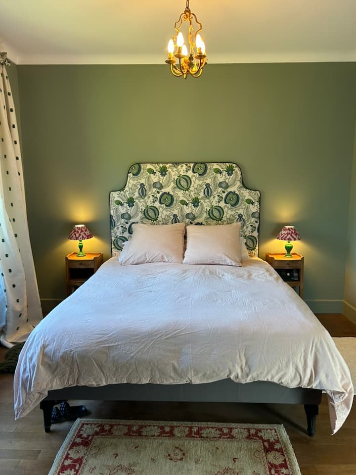 Нашиот смирувачки зелен апартман е нашата најпространа соба. Нуди неверојатен поглед кон полето, шумата и блиските лози . Има 13 м2 со брачен кревет (широк 150-179 см) и табла од цветна ткаенина направена по мерка. Големата сопствена бања е 10 м2 со двојна суета, бесплатна када и отворен италијански туш.
