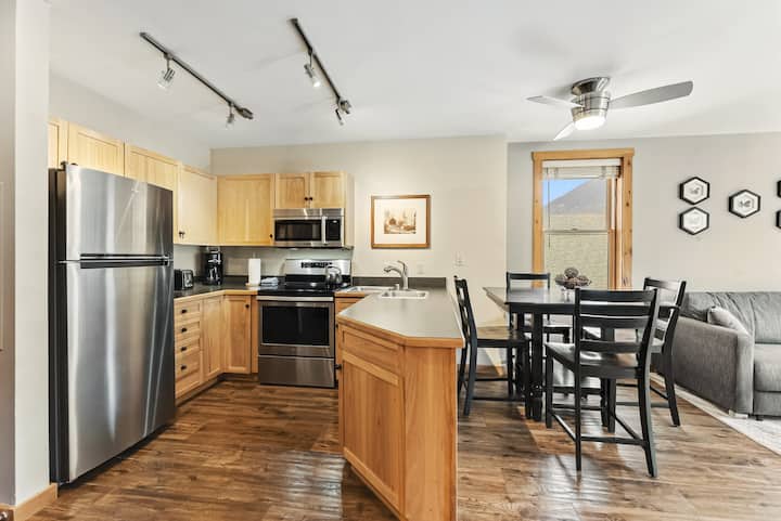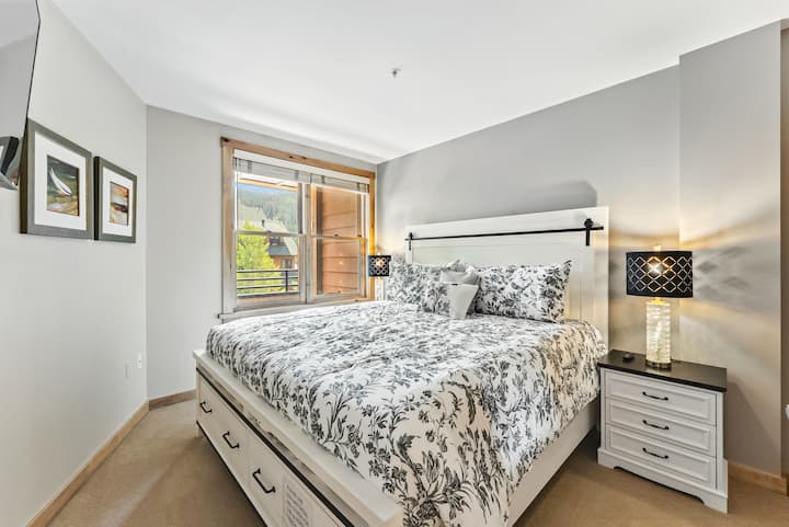 Добре дојдовте во Buffalo Lodge Condo — шармантно алпско место за одмор во првото село Ривер Ран во Кистоун, на само неколку моменти од гондолата. Овој кондоминиум на вториот кат има 4 лица и има сосема нов мебел, луксузен брачен душек, кауч за спиење со големина на брачен кревет и неверојатен поглед кон планината. Уживајте во врвни удобности, пристап до ски-патека, приватен балкон, грејна гаража, хидромасажни кади и друго. 5 минути до езерото Дилон | 15–45 минути до Брек, А-Басин, Вејл, Бакар, Ловленд и друго.