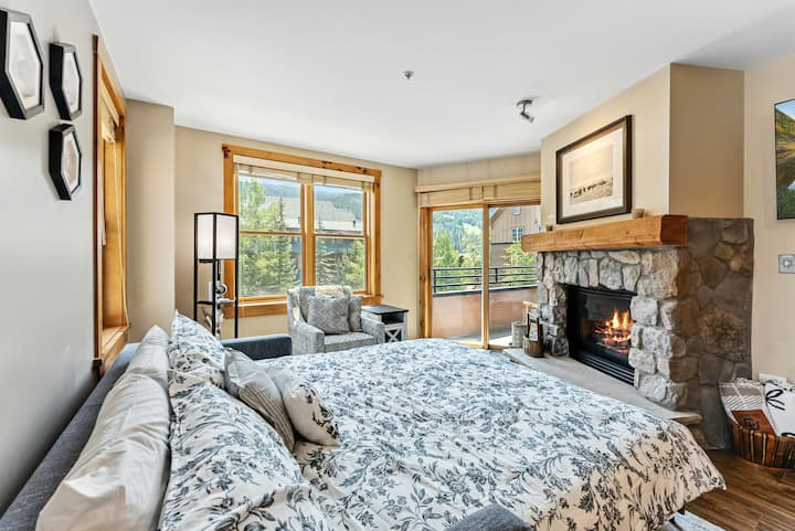 Оваа привлечна дневна соба во ќошот има прекрасен поглед кон падините и селото. Уживајте во топлината на каминот на плин, сосема нов 55-инчен паметен телевизор со премиум канали и супер удобен кауч за спиење со големина на брачен кревет. За да ви биде полесно, обезбедени се дополнителни постелнини и ќебиња. Влезете директно на приватниот балкон од тука за да се опуштите во планинскиот воздух.