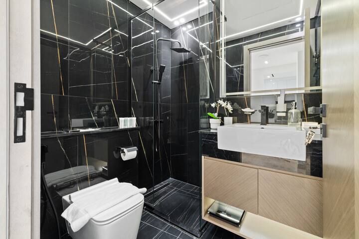 Стилска темна мермерна бања, совршена за опуштање по денот поминат во градот.