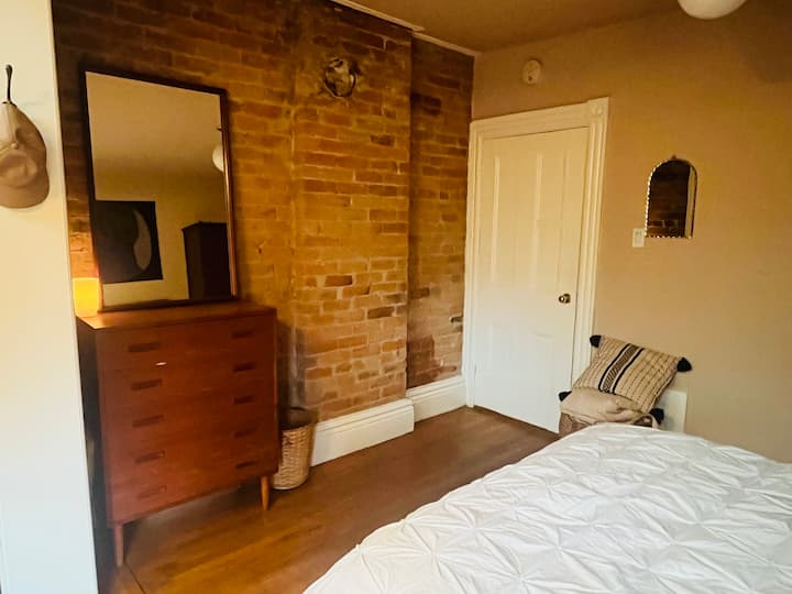 Ова е соба со брачен кревет (широк 150-179 см) во нашата куќа, на горниот кат на вториот кат со индивидуална брава на вашата соба. Живееме долу и се обидуваме да му овозможиме целосна приватност на гостинот на вториот кат. Има посебен влез, но ние сме долу ако ви треба нешто. Живееме на тивка лисната улица, но многу блиску до многу забавни ресторани на улицата Квин. Кратка прошетка до CNE, 22 м пешачење до BMO Field, 15 минути со Uber до TIFF Lightbox, 5 минути од експресниот пат Gardiner.