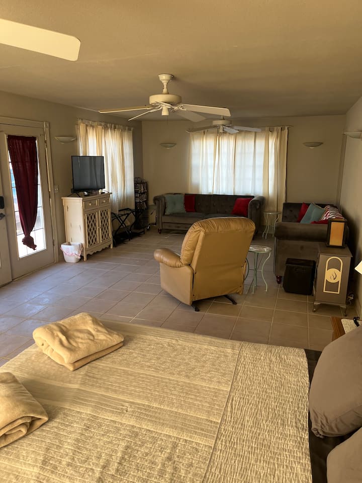 Излезете надвор за да уживате во прекрасните пустински изгрејсонца и мирните вечери под ѕвездите.Казитата нуди приватност и спокојство, а вашиот домаќин живее веднаш до главната куќа - достапен е доколку е потребно, но со почит кон вашиот простор.Без разлика дали истражувате блиски патеки, ги посетувате езерото Хавасу или Кингман или едноставно се опуштате во природа, оваа касита нуди чиста, удобна база за вашиот престој.