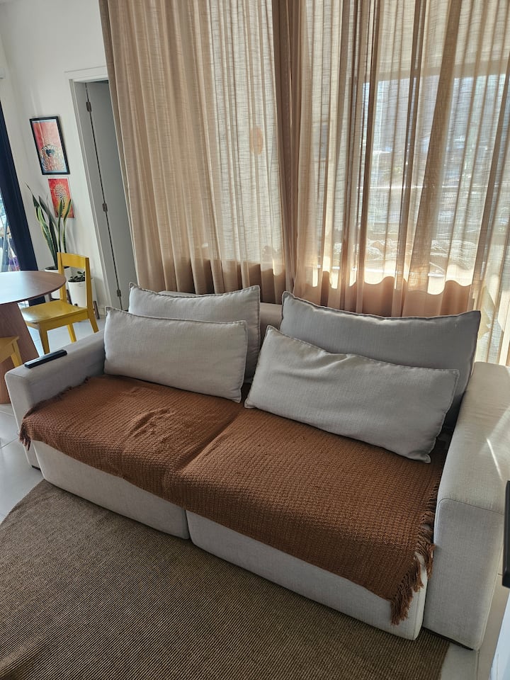 Дизајниран да биде пријатен и функционален, Solar Loft има сѐ што ви треба за да се чувствувате како дома на плажа: удобна спална соба, прекрасен кауч на спуштање, пространа кујна и трпезарија со поглед кон планината, бања со навистина добар туш, простор за домашна канцеларија; и сето тоа во нова, безбедна зграда и тивка локација блиску до плажата!