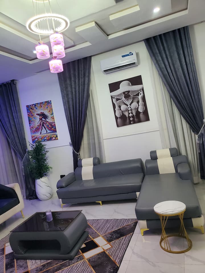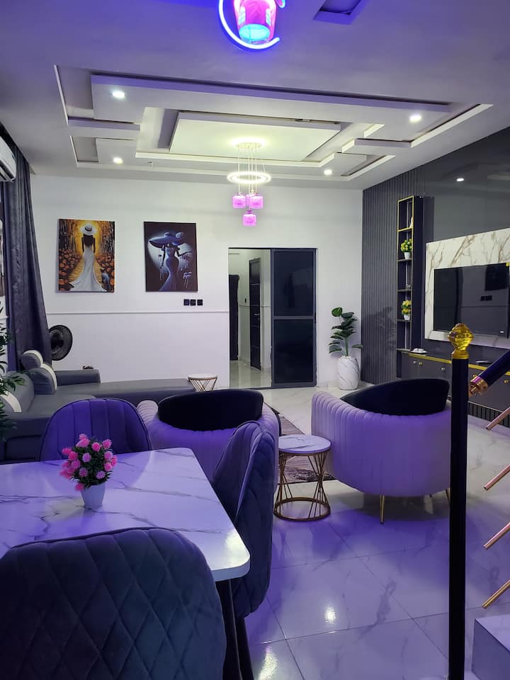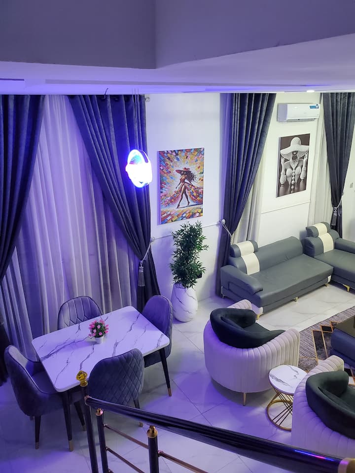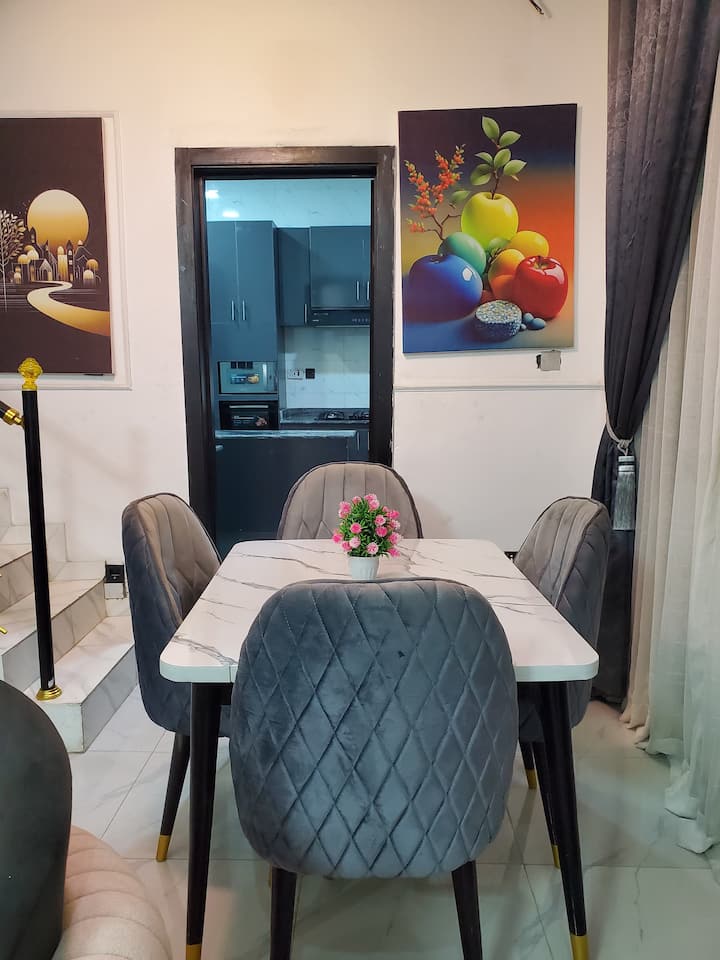 Искусете удобност и забава во овој стилски самостоен дуплекс со 4 спални соби, идеален за семејства, групи и деловни патници. Опуштете се во пространата дневна соба со брз wifi, паметен телевизор и звучен систем со живописен звук или опуштете се во пријатниот салон со балкон. Секоја соба има клима уред, телевизор и вентилатори, а главната соба има сопствен балкон. Уживајте во собата за игри со конзола, 4 бањи плус тоалет за гости, модерна кујна, трпезарија, простор за работа и бесплатен паркинг – совршено за одмор или за подолг престој.