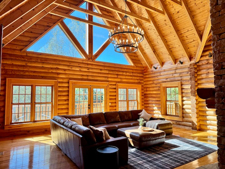 Ова не е само куќа со додатоци – тоа е вистинско прибежиште од дрвена колиба, дизајнирано за поврзување.Големата соба со отворен концепт има засводени тавани, изложени греди и масивен камен камин врамен со прозорци од подот до таванот.