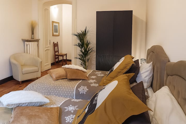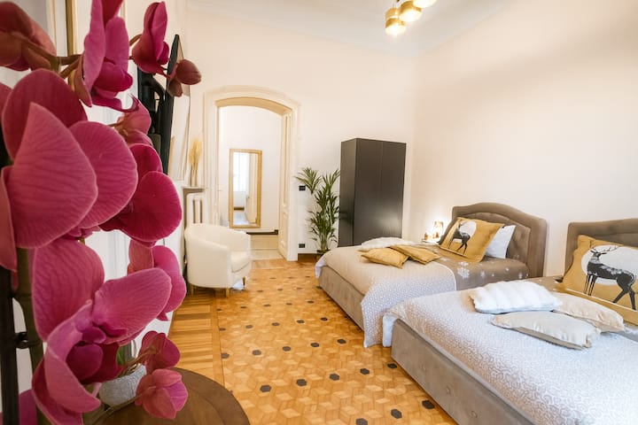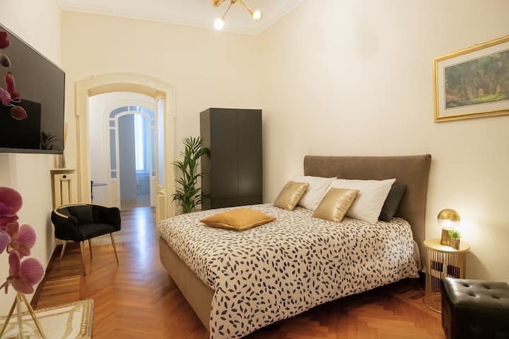 Елегантен стан од 100 квадратни метри во Чит Торино, најшик соседството во градот, од каде што лесно може да се прошетате до центарот, метрото, станицата Порта Суза, автобусите, Судот и облакодерот С. Паоло. Уникатен простор кој комбинира историја, дизајн и удобност, сместен во престижниот Palazzo della Vittoria, неоготичко ремек-дело од 20-тиот век и сцена за филмови како Il Divo и The Broken Key. Продавниците, рестораните, баровите, супермаркетите и престижниот пазар „Пијаца Бенефика“ се на пешачко растојание.