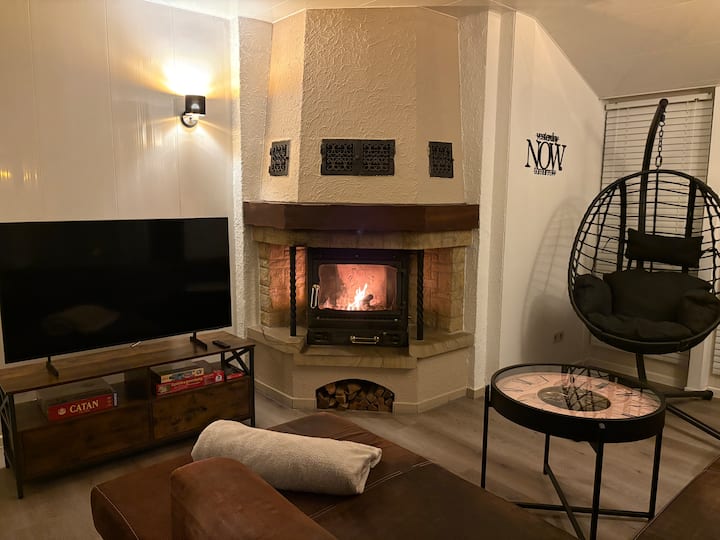 + Во дневната соба ќе најдете удобен кауч за релаксација со масичка за кафе, убав трпезариски простор за вечери со игри или вкусна храна, голем телевизор, лулашка за релаксација, камин и комода со игри на табла.