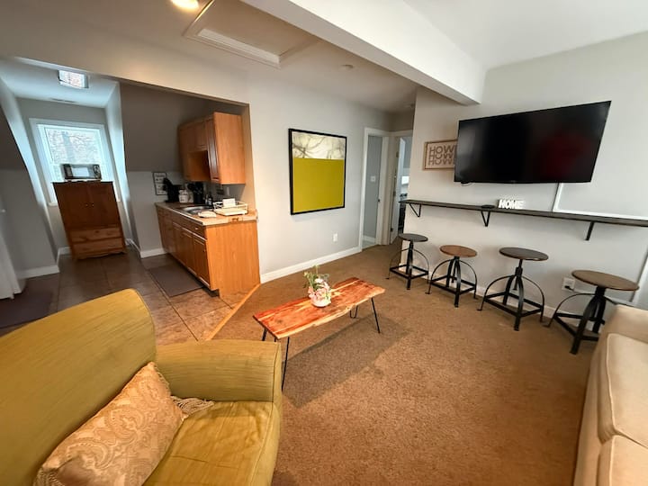 Влезете низ влезната врата и ќе ве пречека вкусно уредена и пространа дневна соба која е совршена за релаксација, со големи прозорци кои пропуштаат многу природна светлина, простор наменет за работа, доволно и удобно место за седење, како и голем Roku телевизор со рамен екран за забава.