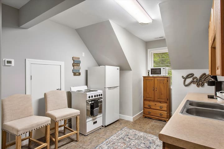 Продолжете нагоре за потребите за појадок, ручек и вечера. Нашата кујна е опремена со компактна рерна, шпорет, микробранова печка, машина за кафе Keurig, компактен фрижидер и замрзнувач и други основни удобности, со доволно простор за шкафови и фиоки за кујнски уреди и направи.