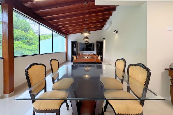 Триплекс куќа со 4 апартмана и интегрирана дневна соба со дневна соба, трпезариска маса, кујна, скара, каучи и 65-инчен паметен телевизор.