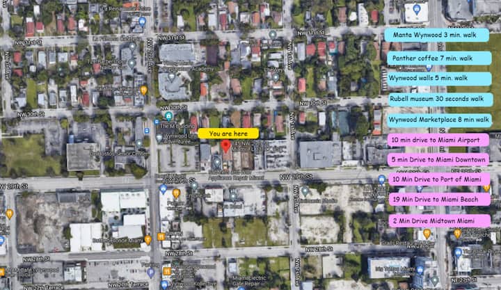 ЛОКАЦИЈА - нашиот имот е веднаш зад аголот од уметничката област Винвуд, трговскиот центар Мидтаун Мајами, а плажите се на 20 минути.