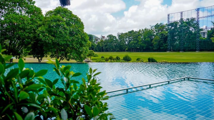 Удобно сместување за тројца со поглед кон планина и голф терен