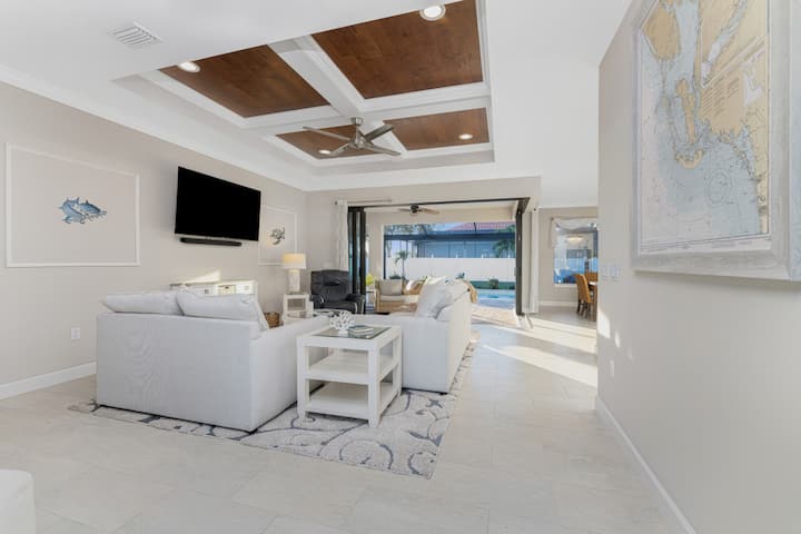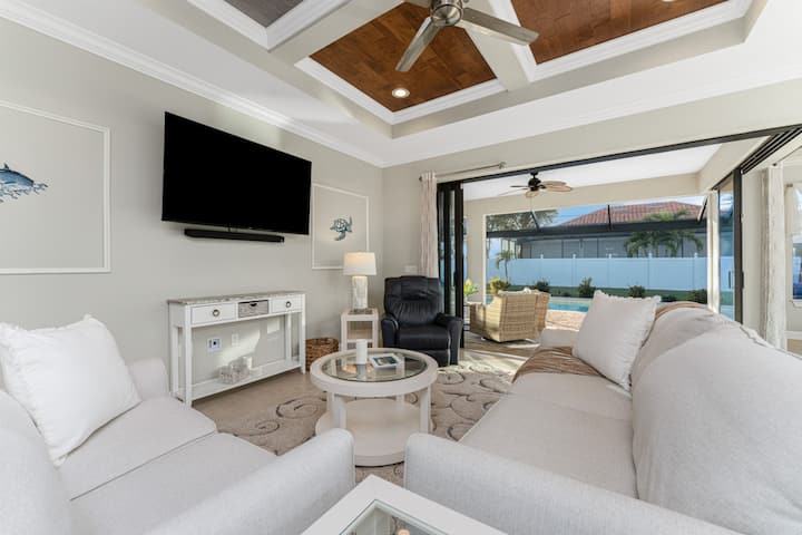 Лизгачките стаклени врати се отвораат кон заштитен веранда со приватен базен со греење, надворешно место за седење и лежалки – совршено за уживање во сонцето и вечерите на отворено во Флорида.