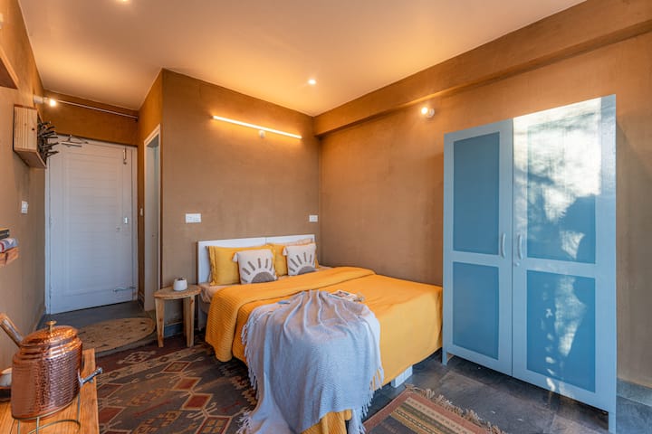 🔥 Оган и гозба – Обликуван од спомените од детството на Митила за Далаан – проѕрачна, отворена колиба пред домот за дружење, игра и лежерни летни дремки. Нежно вклопена во околните фарми и овоштарници, оваа земјена селска колиба ве поканува да уживате во вкусовите на Кумаон, бавно готвени над огниште на дрва, или едноставно да направите пауза, да размислувате и да го впиете тивкиот ритам на животот во планинското село.