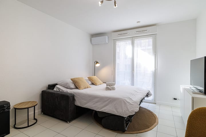 Со совршена локација во близина на јавен превоз, на 15 минути пешачење од пристаништето, Palais des Expositions и Vieux-Nice, ова модерно и функционално студио ги нуди сите удобности што ви се потребни за работа или одмор. Уживајте во опремен балкон за кафе на сонце или за тивка вечера по деновите поминати во разгледување знаменитости или на деловни состаноци.