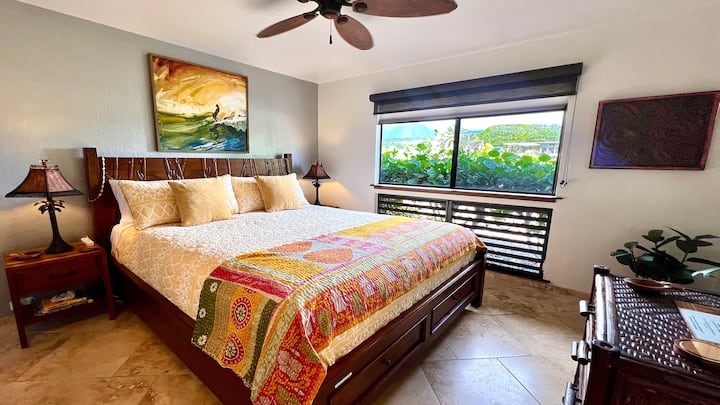 Ова е простран вистински стан со една спална соба во кој може да се сместат до четири лица со Cal King во спалната соба и кауч на спуштање во целосна големина во дневниот простор. Влезот на објектот и спалната соба се свртени кон планината. Ќе се разбудите со нежниот повик на гулаби од оваа страна на објектот. Големата бања е свежо обоена и има оригинални уметнички дела на ѕидовите. Има када и туш, опремени со гел за туширање, шампон и балсам. Нашиот сосема нов бојлер на барање ви обезбедува топла вода за кратко време! Во плакарот за гости има многу дополнителна постелнина, перници и крпи. Спалната соба и бањата се на приземје. Потоа, по кратки скали од травертин се наоѓа дневната соба со отворен план, кујната со целосна големина и трпезаријата, сите под висок засводен таван кој овозможува светол, воздушен простор со одличен поглед од големата веранда на вториот кат. Бидејќи овој објект се наоѓа на горното ниво на зградата, не грижете се за бучавата над вас. Кујната во целосна големина има бар со прекрасни нови столчиња од тврдо дрво каде што можете да се опуштите и да се опуштите со омилениот пијалак. Има сѐ што ќе ви биде потребно за готвење за време на вашата посета, вклучувајќи и некои забавни нови предмети, шпорет за ориз и NutriBullet. Исто така, има своја машина за перење и сушење со залихи на детергент и марамчиња за сушење. Во дневната соба има удобен простор за седење со 48-инчен телевизор со рамен екран над шанкот, брз интернет, Apple TV и кабелска телевизија. Исто така, во него се наоѓа целосна големина, кауч на спуштање со сосема нов душек и постелнина. Трпезаријата има место за четири лица и е веднаш до кујната. Веднаш пред лизгачките врати ќе го најдете вториот кат покриен со ланаи кој е многу простран со димензии 6’ x 20’. Прекрасно е за појадок/кафе на изгрејсонце, вечери на зајдисонце и гледање ѕвезди навечер. Одлично место за читање книга на тапацираната фотелја или да се опуштите со чаша вино и да ги посетите геконите Пог и Гоп. Тие работат напорно за да ги намалат бубачките за сите нас и се добредојдени жители.