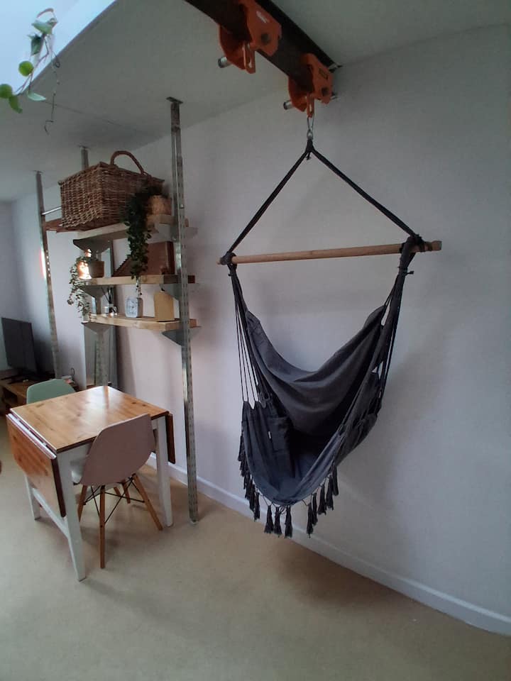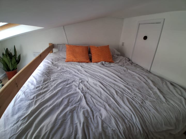 Простор за живеење со супер голем брачен кревет и кујничка