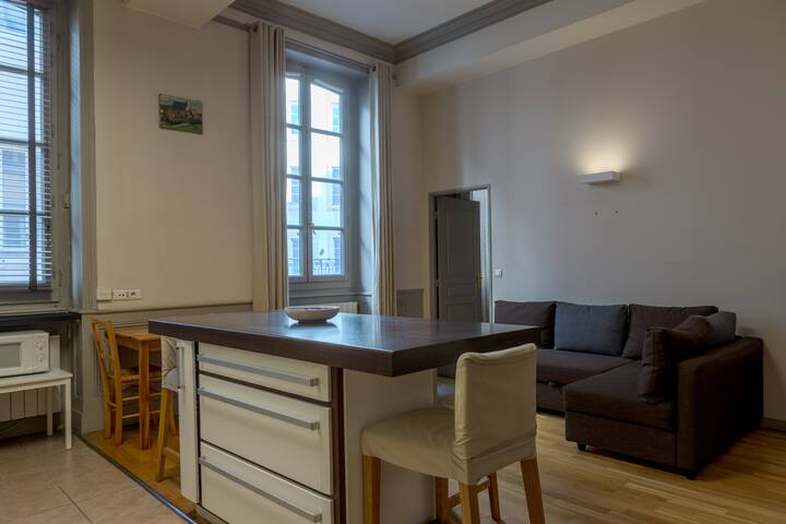 Откријте го овој прекрасен Т2 со мезанин, идеално лоциран во живата и историска област Лион 1ер, на Grande Rue des Feuillants. Овој стан, совршен за 4 гости, комбинира модерна удобност и уникатен карактер за незаборавен престој.